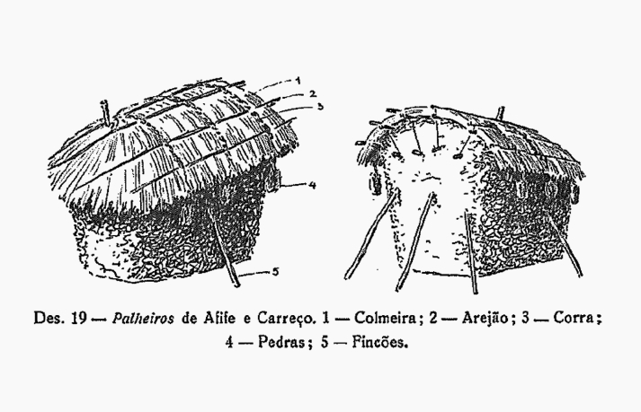 … Já por Afile e Carreço, as que se vêem ao longo da estrada têm uma forma muito particular. São quase sempre pequenos palheiros de forma alongada, cuja cobertura abaulada de colmo, colmeira, pendendo para a retaguarda, é presa por arejões seguros por cordas de palha, corras, donde pendem pedras. As pontas frontais dos arejões são amarradas por arames ou vergas a pequenos paus espetados na massa do sargaço. E é frequente em cima espetarem outro pau, reforçando a segurança da colmeira. Os palheiros são amparados por fincões …”